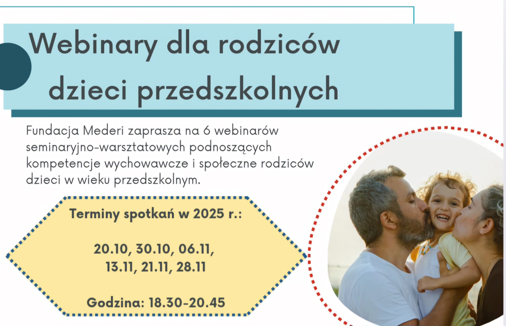 Fundacja Mederi zaprasza na 6 webinarów seminaryjno-warsztatowych podnoszącychkompetencje wychowawcze i społeczne rodzicówdzieci w wieku przedszkolnym. W trakcie webinarów poruszone będą tematy związane z trudnymi emocjami dziecka, z rozwojem dziecka, relacjami ...