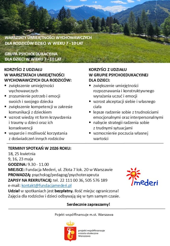 Zwiększenie umiejętności wychowawczych, zrozumienie potrzeb i emocji swoich i swojego dziecka, zwiększenie kompetencji w zakresie komunikacji z dzieckiem, wzrost wiedzy nt. form krzywdzenia i traumy u dzieci oraz ich konsekwencji, wsparcie i możliwość korzystania  z doświadczeń innych rodziców – to wszystko znajdziecie Państwo na warsztatach umiejętności wychowawczych, które ruszają w Fundacji już w kwietniu. Równolegle prowadzona będzie grupa psychoedukacyjna dla dzieci w wieku 7 – 10 lat.